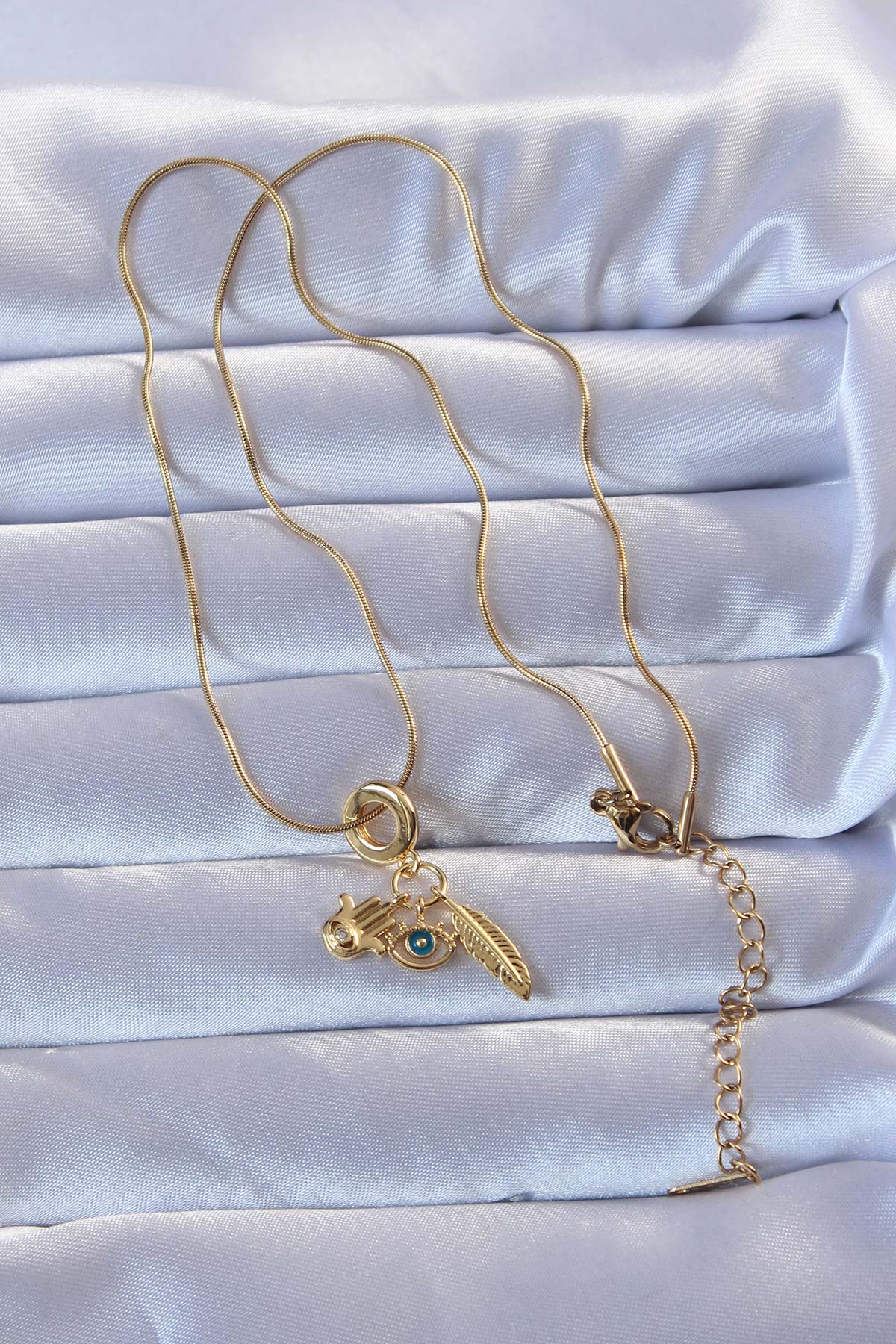 316L Altın Renk Zirkon Taşlı Fatma Ana Eli Yapraklı Kolye