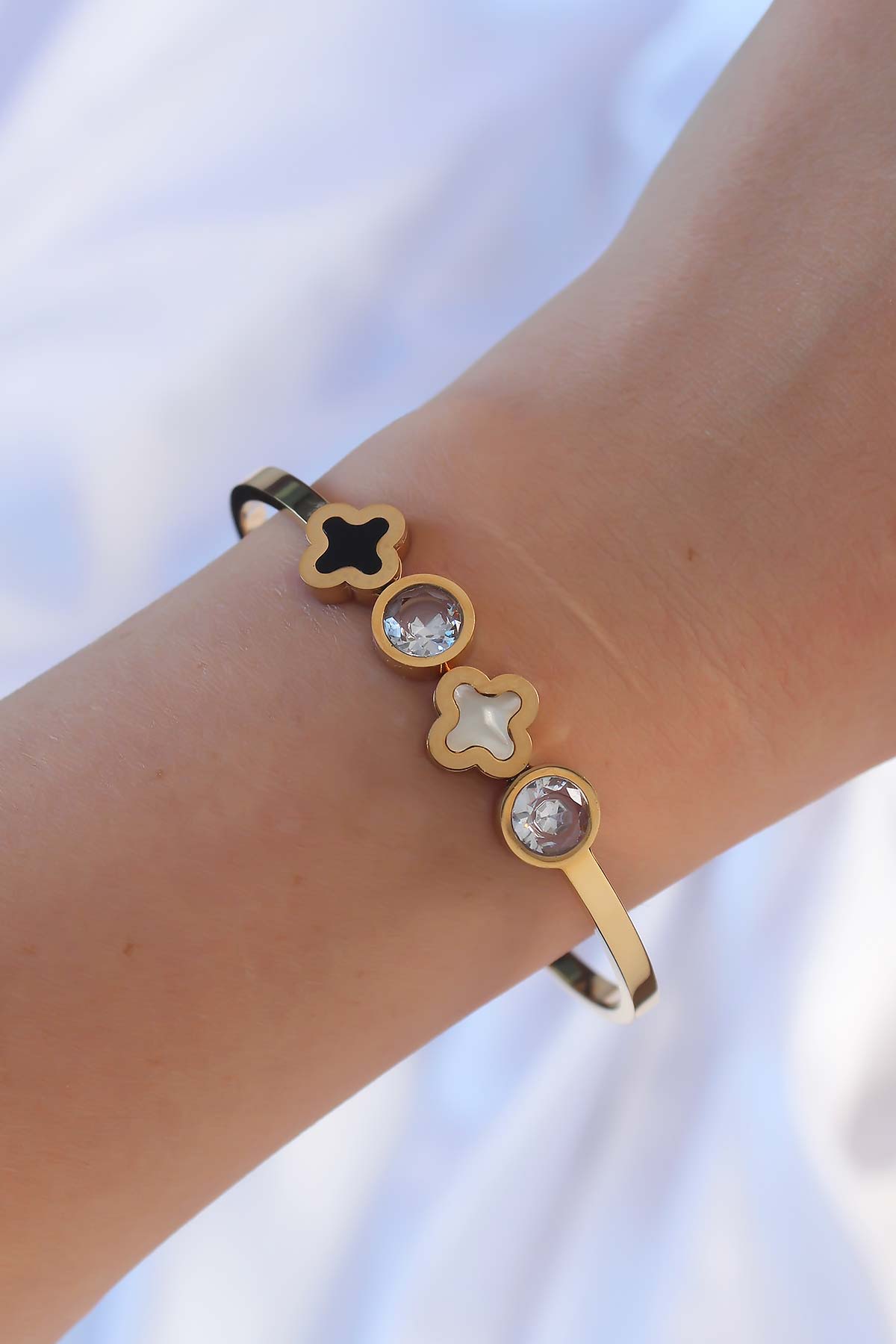316L Çelik Altın Renk Zirkon Taşlı Mineli Yonca Kelepçe