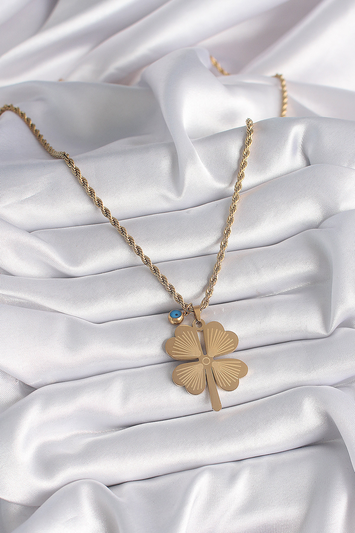 316L Çelik Gold Renk Burgu Zincir Model Yonca Figür Nazar Boncuk Detay Kadın Kolye