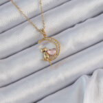 316L Çelik Zincir Altın Renk Pembe Zirkon Taşlı Kedili Ay Kolye